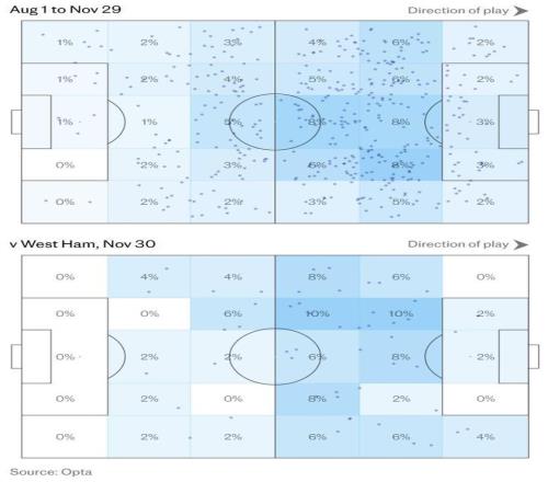 利物浦引進維爾茨,本是看中他在“防線之間”游弋并掌控比賽節(jié)奏的能力。此役的關(guān)鍵在于,斯洛特首次安排維爾茨在赫拉芬貝赫、索博斯洛伊和麥卡利斯特這三名中場身前,以10號位身份首發(fā)。其中,索博斯洛伊犧牲了習(xí)慣的突前位置,承擔(dān)了右路的攻防職責(zé)。 此前,將維爾茨安排在中場三人組之一時,球隊常顯得失衡。一旦他丟球,因中場結(jié)構(gòu)變化而留下的空當極易被對手利用打出反擊,隊友間的聯(lián)系也時常中斷。而在倫敦體育場,球隊陣型明顯更為穩(wěn)固,維爾茨與中場隊友之間首次展現(xiàn)出正在形成的默契。盡管西漢姆聯(lián)給予了過多空間,允許維爾茨輕松接球轉(zhuǎn)身,但他確實看起來更自信、更高效,本應(yīng)收獲一粒進球或至少一次助攻。 在無球時,利物浦也能以更多人數(shù)包圍對手實施反搶。一個有趣的數(shù)據(jù)是:維爾茨本場在進攻三區(qū)及傳入禁區(qū)的關(guān)鍵傳球數(shù),其實與他本賽季的平均水平相近(他仍在等待英超首次助攻)。但這并不能反映他本場比賽在速度、決策準確性和身體對抗上的全面提升。