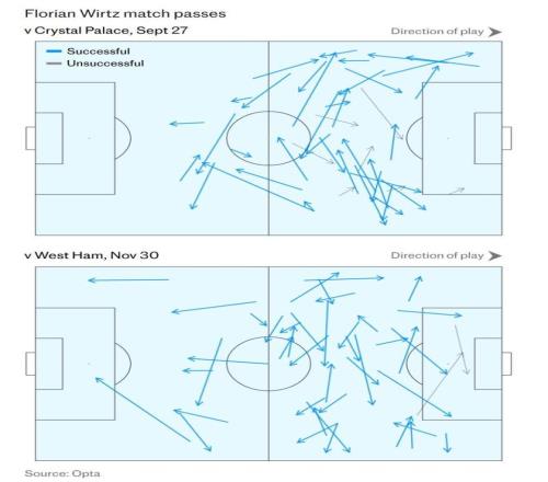 傳球精度是維爾茨的最大資產(chǎn)之一。本場他完成44次傳球,僅失誤2次,成功率高達95%。這與本賽季對陣布倫特福德(76%)和水晶宮(84%)時的低迷形成了鮮明對比。在那兩場失利的比賽中,即便出場時間相同或更長,他的傳球次數(shù)也更少。