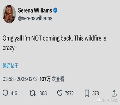 我們再來關(guān)注另一條消息。北京時間昨晚,有外媒報道,稱在退役三年多之后,23屆大滿貫冠軍得主、美國黑珍珠小威廉姆斯有可能在明年復(fù)出,重返賽場。理由是小威的名字被重新列入國際網(wǎng)球誠信機構(gòu)(ITIA)最新的國際注冊檢測名單之中。而根據(jù)規(guī)定,球員必須加入該名單才能參賽,而復(fù)出的退役球員也必須在復(fù)出前至少六個月完成注冊,接受賽外興奮劑檢測。在各方紛紛猜測之際,小威親自出來辟謠了,她稱,“我不會再回來”。