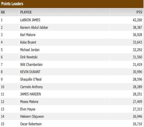 杰倫-布朗在直播中談到了自己拿到12000分的感受,布朗說道:“我就坐在這里想,勒布朗到底是怎么拿到42000分的?” 截至目前,詹姆斯以42260分排名NBA歷史總得分榜第一位,杜蘭特是現(xiàn)役球員得分第二名,目前得到了30996分。