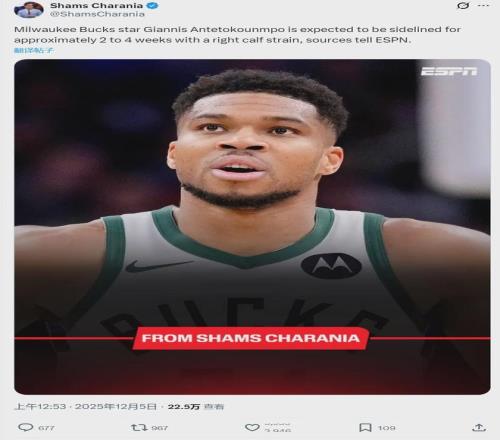 北京時(shí)間12月5日凌晨1點(diǎn),據(jù)NBA名記Shams報(bào)道,字母哥右小腿拉傷,預(yù)計(jì)將休戰(zhàn)2-4周。在雄鹿和活塞的比賽中,開(kāi)場(chǎng)3分鐘字母哥因傷退賽。中外球迷紛紛表示:雄鹿這是對(duì)字母哥進(jìn)行交易保護(hù),害怕他在交易之前再次受傷。