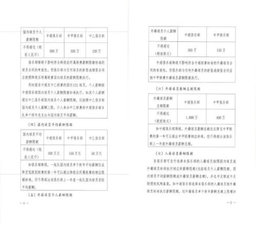 財(cái)務(wù)約定指標(biāo)中包含俱樂部支出限額、一線隊(duì)薪資限額、獎(jiǎng)金限額等,其中一線隊(duì)薪資限額又包含國內(nèi)球員個(gè)人薪酬限額(含港澳臺)、國內(nèi)球員平均薪酬限額、外籍球員個(gè)人薪酬限額、外籍球員薪酬總限額、入籍球員薪酬限額等指標(biāo)。