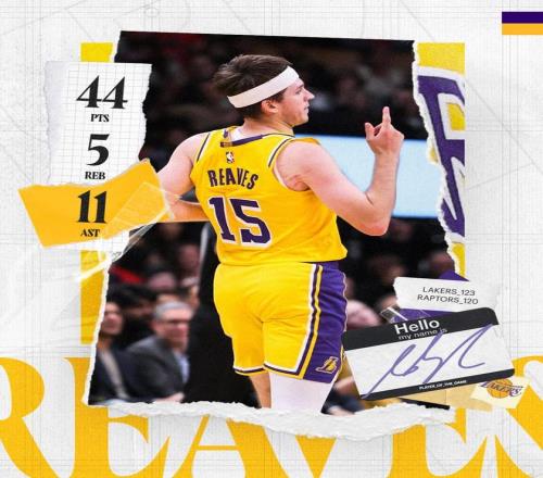 不得不提的是,詹姆斯還創(chuàng)下了NBA第1神跡。詹姆斯追平了本賽季聯(lián)盟單場0失誤助攻的最多紀(jì)錄,杰倫·約翰遜和特雷·瓊斯也有過這種表現(xiàn)。 里夫斯44+11創(chuàng)兩大紀(jì)錄 湖人隊后場巨頭里夫斯,在此戰(zhàn)實現(xiàn)了暴走。里夫斯上場41分鐘,投籃21投13中,三分11中5,罰球15中13,狂轟44分5籃板11助攻的大號兩雙數(shù)據(jù),正負值+5。里夫斯以61.9%的超高命中率轟下了全場的最高分,他還投進了此戰(zhàn)最多的5記三分球。作為全場走上罰球線次數(shù)最多的球員,里夫斯在進攻端侵略性極強。里夫斯上半場砍下了14分,第3節(jié)暴走獨得22分,幫助湖人一度將分差擴大至13分。此外,里夫斯還是此戰(zhàn)助攻次數(shù)最多的球員之一。 里夫斯暴走