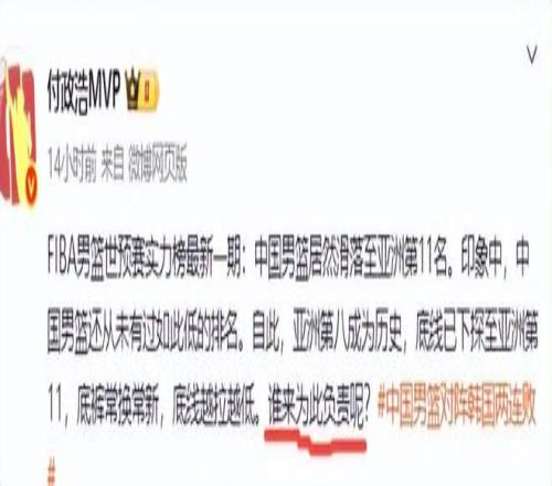 中國(guó)男籃暴跌至亞洲第11名,付政浩發(fā)聲呼吁中國(guó)男籃盡快換帥