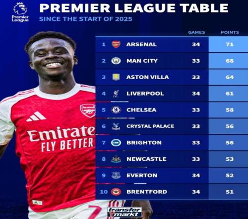 近五輪英超比賽,兩支球隊都只取得1場勝利,利物浦3負(fù)1平1勝,曼聯(lián)1負(fù)3平1勝,同樣積22分,曼聯(lián)1凈勝球,利物浦0凈勝球。 憑借1個凈勝球的優(yōu)勢,曼聯(lián)排名第八,領(lǐng)先排名第九的利物浦。 消息來源:數(shù)據(jù)記錄 3 - 2025積分對比阿森納第一 《轉(zhuǎn)會市場》統(tǒng)計了2025年英超總積分情況,阿森納多賽1場力壓曼城居首的。