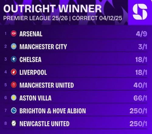 本賽季英超最新奪冠概率: 阿森納——4/9 曼城——3/1 切爾西——18/1 利物浦——18/1 曼聯(lián)——40/1 消息來源:數(shù)據(jù)計算 |
