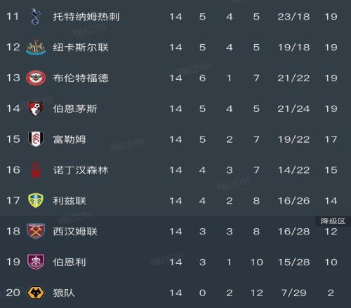 英超積分榜,曼聯(lián)11被逼平,與利物浦同分,西漢姆聯(lián)陷入降級區(qū)
