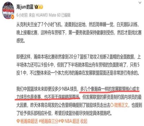 對(duì)此媒體人海jun的藍(lán)也發(fā)文談到了楊瀚森的情況,他表示:“我們中國籃球未來即便沒多少NBA球員,多幾個(gè)像瀚森一樣的發(fā)展聯(lián)盟核心或主力球員也是幸事,也不至于連輸韓國兩場(chǎng)。但發(fā)展聯(lián)盟的薪資是制約國內(nèi)球員的最大因素,昨天體育總局發(fā)的公告里明確提到了鼓勵(lì)球員走出去,也提到了給予俱樂部相應(yīng)補(bǔ)償,希望后續(xù)籃協(xié)能盡快制定具體措施吧。”