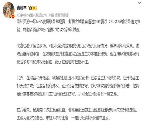 麥穗豐:楊瀚森在開拓者與混音是打不同籃球,戰(zhàn)術(shù)地位完全不同,混音有能持球進(jìn)攻,開拓者只能打無球,楊瀚森有球權(quán)才能顯現(xiàn)自己的才華,他本來就是攻強(qiáng)守弱的特點(diǎn),他需要更多時(shí)間去打磨防守,楊瀚森就該多去G聯(lián)賽打球,在那里有主力地位、穩(wěn)定登場(chǎng)時(shí)間,比在NBA折返跑有意義。