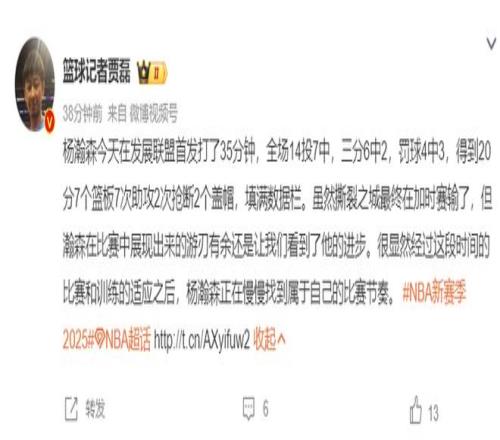 楊瀚森在G聯(lián)賽又打出一場(chǎng)完美的球,全場(chǎng)比賽20+7+7,他直接登上了國內(nèi)的熱搜榜,作為現(xiàn)役中國男籃唯一一個(gè)在NBA打球的球員,中國球迷們都很關(guān)注他的表現(xiàn)。