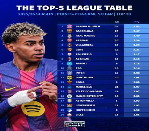 本賽季五大聯(lián)賽場(chǎng)均積分前20:拜仁、巴薩、皇馬、阿森納前4