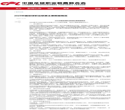 中足聯(lián)發(fā)布《2025中國足球職業(yè)聯(lián)賽主要數(shù)據(jù)概覽》,主要數(shù)據(jù)如下(詳見文末截圖或點(diǎn)擊文末閱讀原文) 一、凈比賽時(shí)間 中超平均凈比賽時(shí)間達(dá)到54分08秒,連續(xù)第三年穩(wěn)步提升;中甲場均凈比賽時(shí)間52分32秒,為近六個(gè)賽季最高;中乙場均凈比賽時(shí)間53分53秒,同樣為近六個(gè)賽季最高。 二、技術(shù)指標(biāo) 中超聯(lián)賽總進(jìn)球771個(gè),外援總進(jìn)球476個(gè),占聯(lián)賽總進(jìn)球61.74%,中超聯(lián)賽場均(兩隊(duì))總跑動225,602.37米,高強(qiáng)度跑距離達(dá)到17,560.87米。 三、紅黃牌和紀(jì)律處罰數(shù)量 中超聯(lián)賽場均黃牌4.13張,場均紅牌0.22張;中甲聯(lián)賽場均黃牌4.38張,場均紅牌0.15張;中乙場均黃牌3.54張,場均紅牌0.19張。2025賽季三級聯(lián)賽共發(fā)布紀(jì)律處罰決定總數(shù)89個(gè),其中中超21個(gè)、中甲21個(gè)、中乙47個(gè),較2024賽季的處罰決定總數(shù)102個(gè)下降21.06%,其中中超下降16%,中甲下降40%,中乙下降12.96%。 四、裁判管理 中國足協(xié)裁委會對三級職業(yè)聯(lián)賽193個(gè)判例進(jìn)行了評議,邀請紀(jì)檢部門、人大代表、政協(xié)委員及權(quán)威媒體95人次監(jiān)督評議。 五、現(xiàn)場觀眾人數(shù)和球迷參與 2025賽季中超、中甲、中乙三級聯(lián)賽累計(jì)現(xiàn)場觀眾人數(shù)達(dá)8,957,759人,較2024賽季同比提升18%。其中中超總觀眾6,180,991人,場均25,754人,大連英博海發(fā)場均58,268人位列榜首,北京國安、成都蓉城主場的場均上座人數(shù)均超過40,000人位列前三,本賽季單場上座最高的比賽為第30輪大連英博海發(fā)主場對陣上海海港的62,330人。 中甲總觀眾1,896,473人,場均7,902人,上座人數(shù)最高的單場比賽為第17輪遼寧鐵人與重慶銅梁龍,單場上座39868人;中乙總觀眾880,295人,場均2,445人,上座人數(shù)最高的單場比賽為揭幕戰(zhàn)第1輪貴州筑城競技對陣?yán)ッ鞒切?,單場上?1569人。 六、賽事影響力 中超微博粉絲達(dá)619.7萬,賬號全賽季總閱讀量2.7億,賽事話題.5億,2025年閱讀量增長為8億。中超聯(lián)賽新媒體端全域累計(jì)1.827億人次觀看,同比增長30.21%;累計(jì)播放次數(shù)5.785億,較上賽季上漲14.87%。中甲電視與新媒體累計(jì)觀看61,583,297人次;中乙電視與新媒體累計(jì)觀看13,462,724人次。 七、青年球員出場與表現(xiàn) 中超聯(lián)賽U21球員出場554人次,首發(fā)307人次,總出場時(shí)間33,937分鐘,其中U21球員打滿全場的160人次,出場時(shí)間超過45分鐘的339人次。本賽季U21球員的場均出場人次比2024賽季增長了172%,場均出場時(shí)間比2024賽季增長了238.7%。中甲總計(jì)97名U21球員出場,出場總?cè)舜芜_(dá)1191人次,出場總時(shí)間為69888分鐘;本賽季中乙聯(lián)賽共有323名U21球員出場,出場總?cè)舜?404人次,總時(shí)間為284999分鐘。 八、商業(yè)開發(fā)和賽場活動 2025賽季,三級職業(yè)聯(lián)賽總體商業(yè)開發(fā)收入較2024賽季實(shí)現(xiàn)增長13%,其中中超聯(lián)賽商業(yè)開發(fā)收入同比提升10%。 圖片 | 中足聯(lián) |