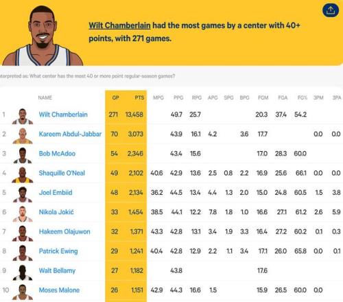 本場比賽,掘金隊當家球星約基奇出場35分36秒,26投13中砍下了40分9籃板8助攻的準三雙數據,另有1搶斷1蓋帽入賬,三分球8中1,罰球15中13,出現(xiàn)了2次失誤和1次犯規(guī),正負值為-15。 據統(tǒng)計,本場比賽是約基奇職業(yè)生涯第33次砍下40+得分,他超越了奧拉朱旺,成為NBA歷史上單場40+得分場次數第六多的球員。在他身前的分別是張伯倫(271)、賈巴爾(70)、麥卡杜(54)、奧尼爾(49)和恩比德(48)。