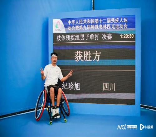 賽后的紀(jì)珍旭。 輪椅組男單決賽在兩位四川選手之間上演,紀(jì)珍旭3:5、5:3、4:1逆轉(zhuǎn)杜超奪冠。在三、四名決賽中,另一位四川選手董順江4:1、4:1擊敗北京選手馮小敏。這樣一來(lái),三位四川選手紀(jì)珍旭、杜超、董順江包攬了男單的金銀銅牌。 輪椅組男雙決賽同樣在兩對(duì)四川選手之間進(jìn)行,董順江/紀(jì)珍旭4:0、5:3戰(zhàn)勝杜超/劉洋;在銅牌爭(zhēng)奪戰(zhàn)中,北京隊(duì)的丁錦輝/馮小敏4:0、4:0擊敗廣東隊(duì)的陳金威/謝柳龍。本次比賽中,紀(jì)珍旭在自己參加的男團(tuán)、混雙、男單和男雙中全部奪冠,成為了本屆殘?zhí)貖W會(huì)網(wǎng)球比賽的“四金王”。 賽后,紀(jì)珍旭非常開心和激動(dòng),他說(shuō):“對(duì)這次的成績(jī)非常滿意。其實(shí)這一路走來(lái)非常不容易,希望我拿到這個(gè)成績(jī)之后,讓更多人看到我們這個(gè)項(xiàng)目的存在,看到我們輪椅網(wǎng)球運(yùn)動(dòng)員的拼搏和不放棄的精神,讓更多人燃起對(duì)生活的希望。我們可以實(shí)現(xiàn)自己的價(jià)值,我相信每個(gè)人都可以做到?!?/p>