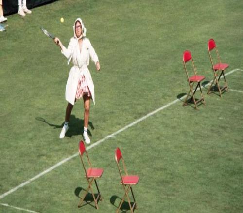 鮑比·里格斯身著女仆裝 在場地中放了4把椅子和對手比賽 另一邊的比利·簡·金則非常認真地進行著訓練,因為她有不得不贏的理由——如果她能擊敗鮑比·里格斯,那么所有認為自己應(yīng)該獲得同工同酬、平等機會和平等尊重的女性都將分享這份勝利。 而輸?shù)裟菆霰荣惖拇鷥r會是巨大的,比利·簡·金曾經(jīng)提到: “我認為如果我輸?shù)裟菆霰荣悾泳W(wǎng)球的發(fā)展將會倒退50年。這將毀掉女子巡回賽,并打擊所有女性的自尊心?!?/blockquote> |