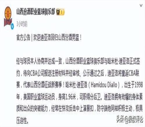 官方公告歡迎迪亞洛回歸山西汾酒男籃!