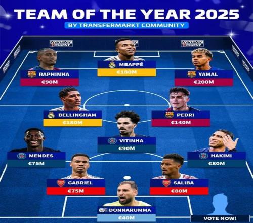 北京時(shí)間12月6日,德轉(zhuǎn)通過用戶投票評(píng)出2025年的最佳陣容,姆巴佩和亞馬爾領(lǐng)銜,巴塞羅那和巴黎圣日耳曼各有3名球員入選,皇家馬德里和阿森納2人入圍。