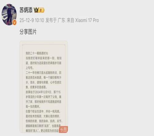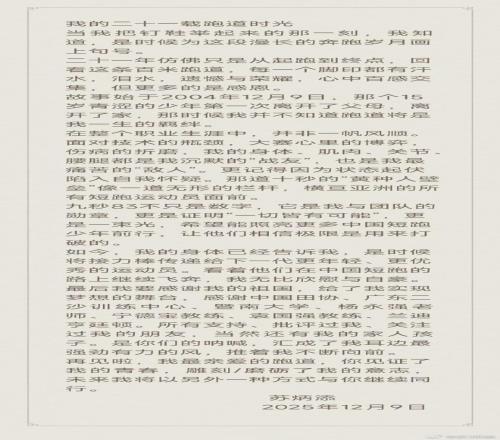 剛剛(12月9日),男子100米亞洲紀(jì)錄保持者、中國(guó)短跑名將蘇炳添發(fā)布微博宣布退役。 全文如下: