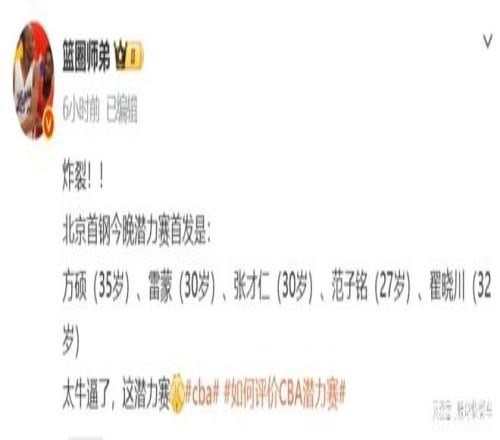 CBA新賽季才剛開打兩天,CBA聯賽便曝出了最荒唐一幕。作為CBA新賽季增設,為了培養(yǎng)新人的潛力賽,竟然直接淪為老年賽了。在北京隊以84-74擊敗江蘇隊以后,隨后的潛力賽,北京隊派出了死亡五老,翟曉川、方碩、范子銘、張才仁以及雷蒙領銜出戰(zhàn),要知道,這5人可是北京隊的老將,他們的平均年齡已經達到30.8歲。不知道CBA這潛力賽,究竟是培養(yǎng)新人呢,還是鍛煉老將?