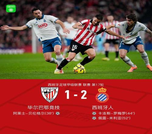 北京時間12月23日,西班牙足球甲級聯(lián)賽第17輪展開角逐,畢爾巴鄂競技主場迎戰(zhàn)西班牙人。上半場,阿萊士-貝倫格爾破門率先取得進球。隨后,卡洛斯-羅梅羅扳平比分。下半場,多蘭送出助攻,佩蘭-米利亞破門將比分反超。最終,西班牙人客場2-1逆轉(zhuǎn)畢爾巴鄂競技。