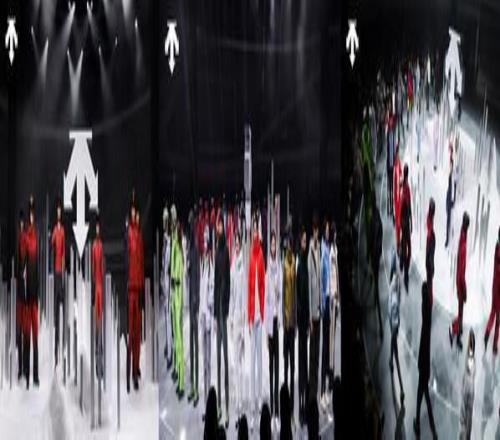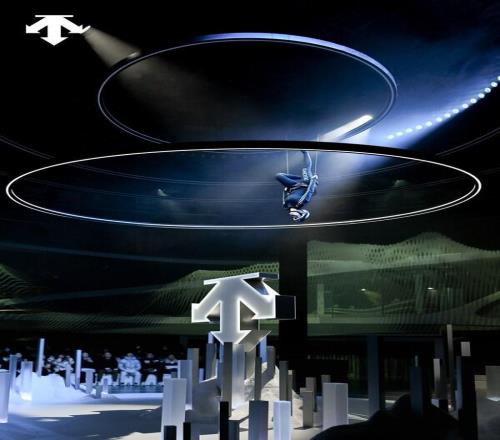 隨著光影點亮象征未來的時空之門,"未來使者"身著未來感裝備自高空滑入秀場,將"未來之城"轉(zhuǎn)化為立體的冰雪場域。隨著他的落點,環(huán)幕之上山峰與雪線被逐一喚醒,仿佛一座真實雪場被帶入現(xiàn)場。這一幕呼應(yīng)著迪桑特"一切始于滑雪"的品牌基因——滑雪運動的專業(yè)內(nèi)核早已深植品牌之中,而這場空中演繹,正是對這份初心的當(dāng)代詮釋,更以動感姿態(tài)串聯(lián)起冰雪文化、科技表達與品牌精神,構(gòu)建起品牌從專業(yè)根基邁向未來運動文明的完整視覺語言。