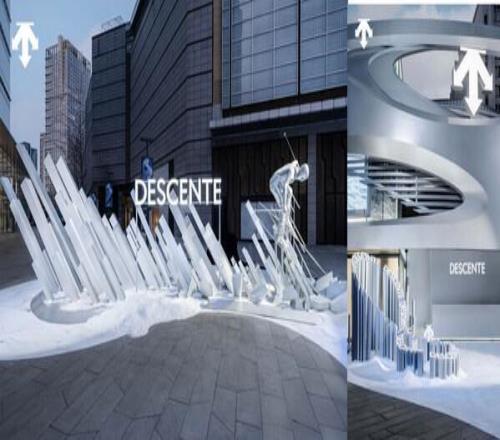 啟幕未來,專業(yè)基因開啟全新篇章 本次"問頂未來"品牌大秀以迪桑特北京華貿(mào)全球旗艦店——"未來之城"為敘事起點,讓建筑本身成為大秀的核心敘事載體。"未來之城"的設(shè)計核心源自無限向前的概念——莫比烏斯環(huán),空間以此為母體,結(jié)合品牌基因化作無限延展的雪道,營造出周行不息的視覺體驗。大秀外場以"未來雪域"為靈感,圍繞滑手破雪的雪浪意象,打造出冰晶光束與金屬結(jié)構(gòu)交織的光影裝置。這一裝置與建筑立面的莫比烏斯環(huán)相呼應(yīng),科技感與冰雪意象交融,既構(gòu)筑起通往未來運動世界的第一視覺印象,也讓嘉賓未入內(nèi)場便沉浸于品牌營造的未來語境中。