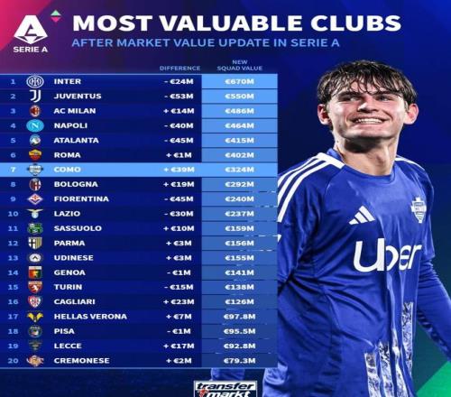 德轉(zhuǎn)列意甲俱樂部身價排名:國米6.7億歐第一,尤文5.5億第二
