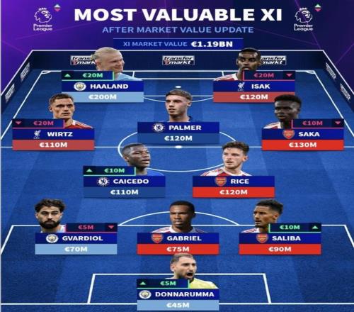 最近德國轉會市場聯合英超官方公布了一套“英超身價最高最佳陣容”,哈蘭德、薩卡、賴斯等球員都在其中。相比之下,羅德里、厄德高、阿利森這些呼聲很高的名字卻無緣入選,也難免讓人議論。數據截至撰文時間(北京時間2025年12月10日),這套身價豪華陣容到底能踢成什么水平,就看各個位置的配置和球員近期狀態(tài)了。 具體陣容前鋒 哈蘭德 | Erling Haaland 身價:2億歐元 效力俱樂部:曼城 國籍:挪威 年齡:25歲 身價變化:+2000萬歐元 伊薩克 | Alexander Isak 身價:1.2億歐元 效力俱樂部:利物浦 國籍:瑞典 年齡:26歲 身價變化:-2000萬歐元 薩卡 | Bukayo Saka 身價:1.3億歐元 效力俱樂部:阿森納 國籍:英格蘭 年齡:24歲 身價變化:-1000萬歐元