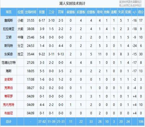 比賽數(shù)據(jù): 活塞:康寧漢姆27分5板11助、薩瑟19分2板5助2斷、斯圖爾特15分2板、杜倫14分8板2助5斷、霍蘭11分7板、艾維9分2板2助、格林8分4板2助2帽、奧薩爾7分2板3助、哈里斯7分 湖人:東契奇30分5板11助、詹姆斯17分4板4助、海斯13分2板2助、艾頓10分2板、克內(nèi)克特10分2板、拉拉維亞9分4板1助4斷、范德比爾特8分8板1助、斯瑪特6分2板5助3斷