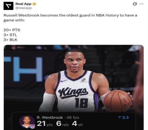 憑借這樣的表現(xiàn),37歲54天的威少成為NBA歷史上單場(chǎng)拿到至少20分3斷3帽最老的后衛(wèi)。