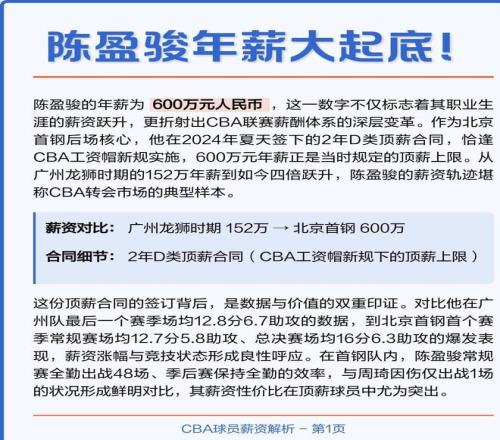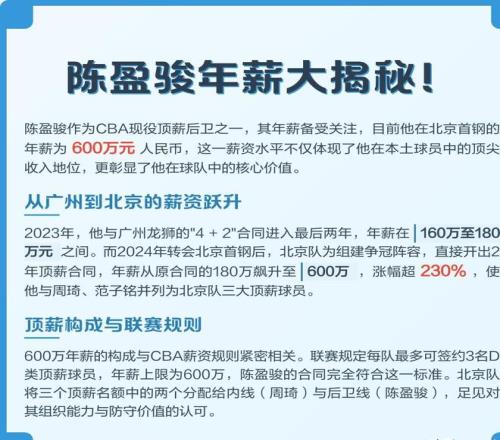 2023年,表現(xiàn)出色的陳盈駿,跟廣州隊(duì)續(xù)約了三年頂薪合同,年薪直接飆升到600萬! 截至這份合同的最后一年,他在廣州隊(duì)這6年時(shí)間里,光是薪水,就拿到了912萬! 再加上這三年頂薪的1800萬,他CBA生涯前9年的薪水總額,直接達(dá)到了2712萬! 我的天,再加上廣告代言、商業(yè)活動(dòng)收入,以及休賽期代表中國臺(tái)北隊(duì)參賽的酬勞,他的總收入,早就突破了3000萬大關(guān)!
