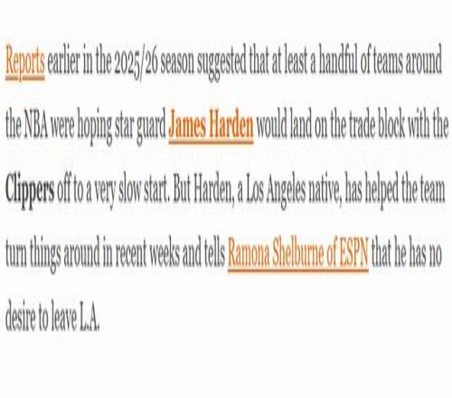 北京時(shí)間1月17日,2025-26賽季初期曾有報(bào)道稱,由于快船隊(duì)開局戰(zhàn)績慘淡,聯(lián)盟中至少有幾支球隊(duì)都盼著當(dāng)家后衛(wèi)哈登能被擺上交易貨架。但身為洛杉磯本地人的哈登,在過去幾周助力球隊(duì)扭轉(zhuǎn)頹勢,他在接受ESPN采訪時(shí)明確表示,自己毫無離開洛杉磯的念頭。