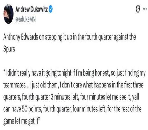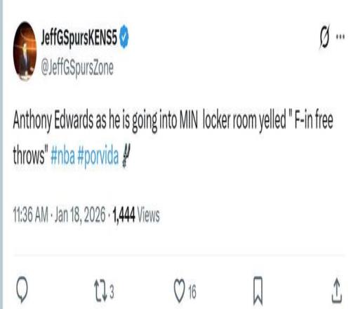 本場比賽愛德華茲也用行動證明他沒有說大話,在球隊(duì)半場落后25分的情況下,愛德華茲帶傷出戰(zhàn)33中19,三分16中9,爆砍生涯新高的55分,外加4板3助。 硬是憑借不講理的進(jìn)攻表現(xiàn)率領(lǐng)殘陣在背靠背的情況下將比賽懸念重新打了回來,無奈關(guān)鍵時刻點(diǎn)球戰(zhàn)術(shù)時愛德華茲罰丟了一球,加上文班總能給出回應(yīng)球,最終森林狼沒能再度上演大逆轉(zhuǎn)好戲。 比賽結(jié)束后能夠看到愛德華茲滿眼不甘,同時馬刺隊(duì)記JeffGSpursKENS5曝出賽后愛德華茲怒爆粗口:“去TMD罰球!”以表達(dá)對于自己丟掉關(guān)鍵罰球的不滿。