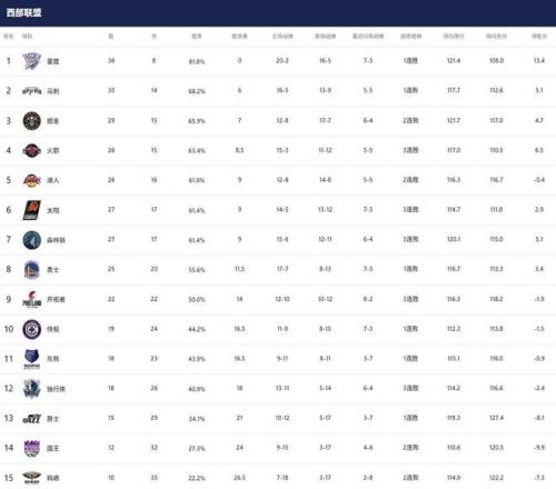 11-15名:灰熊(18勝23負(fù))、獨(dú)行俠(18勝26負(fù))、爵士(15勝29負(fù))、國(guó)王(12勝32負(fù))、鵜鶘(10勝35負(fù))