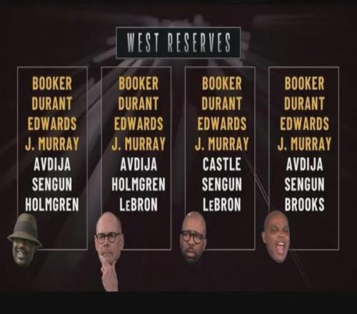 全明星替補陣容是由30支球隊主教練投票選出,TNT天團這次投票雖然無法決定倫納德是否入選全明星,但也間接表明了媒體對各個球員的態(tài)度。有四個球員是TNT天團四人共同選擇的:布克、杜蘭特、愛德華茲和賈馬爾-穆雷。