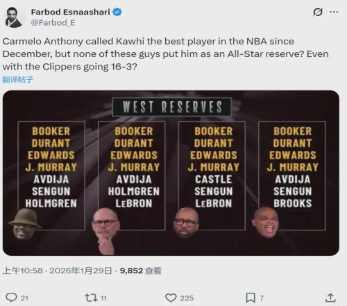 北京時間1月29日,TNT天團(奧尼爾、巴克利、肯尼-史密斯和厄尼-約翰遜)選擇全明星西部替補,快船球員倫納德0票??齑浾逨arbod Esnaashari炮轟:“快船過去19場16勝3負,倫納德是過去一個月聯(lián)盟最佳球員,居然沒人選他?”