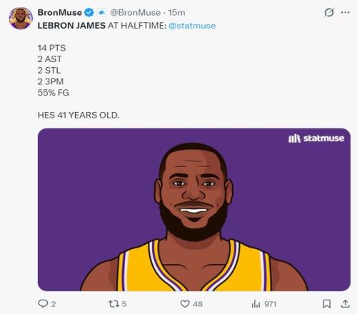 而且勒布朗上半場打了17分鐘,他以55%的命中率拿到14分1籃板2助攻2搶斷2個三分球,勒布朗打無球的效率也很高,41歲的老頭子再一次打臉外界的質(zhì)疑。