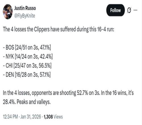 兩大敗因明顯 在哈登與小卡轟下46分的情況下,19戰(zhàn)16勝的快船隊之所以慘敗,兩大輸球原因明顯。 原因一:掘金恐怖的三分投射表現(xiàn) 全場掘金隊三分28投16中,命中率高達(dá)57.1%,可謂是高產(chǎn)又高效,加上三分得分點眾多,讓快船隊在防守端無可奈何。 而對手三分投射的命中率也是快船隊過去20場比賽的勝負(fù)手,當(dāng)快船隊取勝時對手三分命中率僅為28.4%,輸球時對手的三分命中率則高達(dá)52.7%。