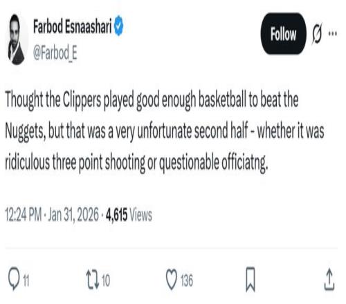 原因二:爭議巨大的吹罰 正如賽后快船記者Farbod Esnaashari所說:“盡管快船本場比賽的表現(xiàn)足以擊敗掘金,但下半場的狀況的確艱難,不僅要面對離譜的三分投射效率,還要應(yīng)對頗具爭議的吹罰尺度?!?/p>