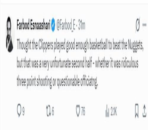 賽后船記Farbod Esnaashari繼續(xù)吐槽,盡管快船隊的整體表現(xiàn)還算不錯但還是沒能擊敗掘金,無論是球隊一波荒誕的三分出手還是裁判那令人窒息的吹罰尺度。