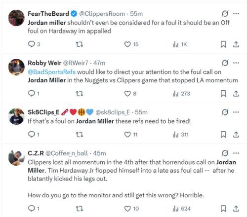 很多的快船球迷也開始吐槽裁判:1.請裁判注意一下,你們吹罰米勒對小哈犯規(guī)那球絕對是個誤判,那個球破壞了快船的勢頭; 2.如果喬丹-米勒那個球都算犯規(guī),那么裁判應(yīng)該下崗了; 3.第四節(jié),喬丹-米勒被吹罰的三分犯規(guī)直接讓快船失去了優(yōu)勢,小哈達(dá)威是一個明顯的往前跳的動作,那本該吃他進(jìn)攻犯規(guī); 4.裁判明明看了回放還給米勒犯規(guī)?糟糕透了。 |