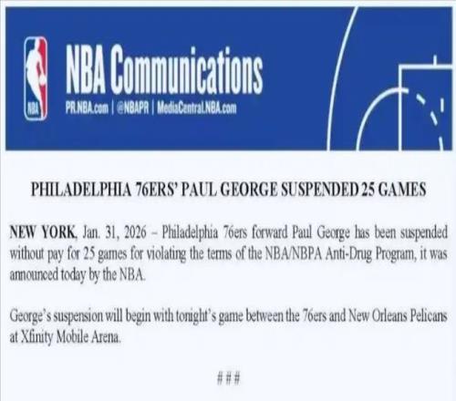 然而,就在今天,76人收到了聯(lián)盟的一紙罰單,瞬間將所有期待粉碎。NBA官方發(fā)布重磅處罰:費城76人隊前鋒保羅·喬治因違反聯(lián)盟反興奮劑條例被禁賽25場!