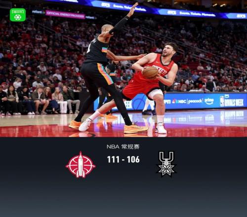 第一節(jié)火箭杜蘭特拿下7分,馬刺尚帕尼拿下15分,首節(jié)戰(zhàn)罷火箭28-39落后馬刺 第二節(jié)火箭申京拿下8分,馬刺文班亞馬拿下10分,半場結(jié)束火箭60-70落后馬刺 第三節(jié)火箭申京拿下6分,馬刺斯蒂芬-卡斯?fàn)柲孟?分,第三節(jié)結(jié)束火箭82-92落后馬刺 第四節(jié)火箭里德-謝潑德拿下12分,馬刺凱爾登-約翰遜拿下4分,最終火箭111-106戰(zhàn)勝馬刺