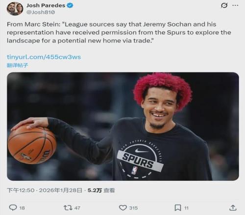 據(jù)NBA名記Marc Stein報道,馬刺前鋒杰里米-索漢和他的經(jīng)紀(jì)團隊已經(jīng)獲得馬刺許可,經(jīng)紀(jì)團隊將為索漢尋找新東家以促成交易?,F(xiàn)在距離交易截止日僅剩一周,時間并不充裕,索漢能否成功找到下家,就看經(jīng)紀(jì)團隊的能力了。