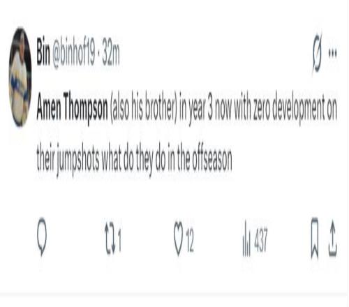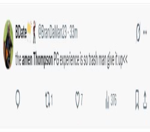 火蜜:阿門-湯普森在進(jìn)攻方面太沒用了。他完全破壞了球的運(yùn)轉(zhuǎn)節(jié)奏,因?yàn)樗谇驁錾系娜魏挝恢枚疾痪邆渫{性,只有在籃下才有威脅。