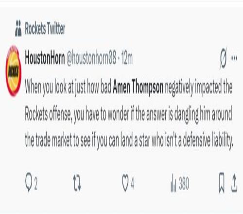 休媒:當(dāng)你仔細(xì)想想阿門對火箭隊進(jìn)攻造成的負(fù)面影響之嚴(yán)重時,你不禁會想,是不是應(yīng)該把他放到交易市場上拋售一番,看看能否淘到一位既不防守糟糕又具備明星實(shí)力的球員呢?