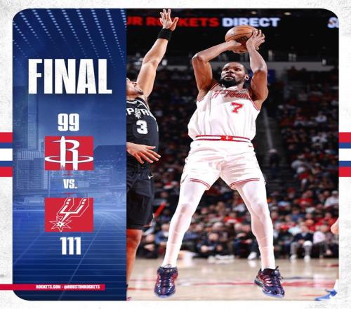 申京、阿門相繼強攻內(nèi)線未果,文班亞馬2罰全中,距離終場不足52秒,烏度卡換上板凳席末端的球員,選擇提前認(rèn)輸,比賽就此失去了懸念??ㄅ謇?罰1中,隨后完成扣籃,最終,馬刺以111比99力擒火箭,上演了16分大逆轉(zhuǎn)好戲。休斯頓單節(jié)以13比27落后,火箭末節(jié)投籃23投僅4中,三分2中0,慘遭翻盤。 兩隊數(shù)據(jù) 火箭隊,阿門23中11得到25分7板4助3斷,末節(jié)7中1僅僅得到2分。伊森10中4得到10分6板3斷、謝潑德12中4,三分球4中1得到9分5板2帽,進(jìn)攻端效率偏低,防守端成為場上黑洞。小賈巴里史密斯8中3得到8分7板2助、卡佩拉5分4板2帽、奧科吉3中0得到0分3板3助、芬尼-史密斯2中0得到0分2板、霍勒迪1助。 馬刺逆轉(zhuǎn)火箭