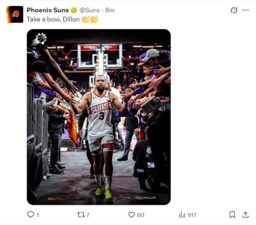 40+8迎生涯之夜!太陽官方為狄龍鼓掌美記:徹底改變鳳凰城文化