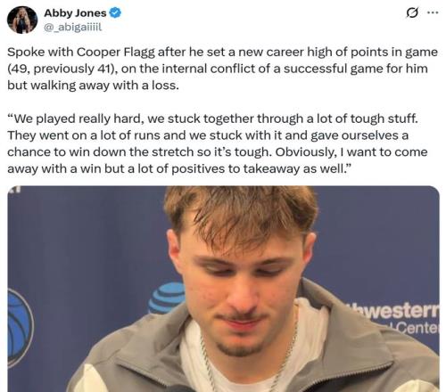 賽后談到與弗拉格同場對(duì)決,克努佩爾坦言:“全明星賽時(shí)自己會(huì)與他見面,然后我倆準(zhǔn)備在那個(gè)周末之后一起回一趟杜克大學(xué),剛才我倆就在聊這些?!?/p> 談及兩人對(duì)于最佳新秀的爭奪,克努佩爾說道:“我們都渴望贏得勝利,但我們不會(huì)聊這個(gè),我想他拿下49分10籃板后概率會(huì)反超我,但事情就是這樣,能拿獎(jiǎng)很酷,但無論誰拿到,我都會(huì)為他高興?!?/p>