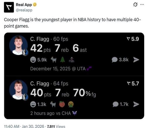 第六項(xiàng):弗拉格成為詹姆斯與愛德華茲之后,NBA歷史上第三位多次砍下40+的青少年球員(13歲-19歲); 第七項(xiàng):19歲40天的弗拉格成為史上單場得分45+最年輕的球員。